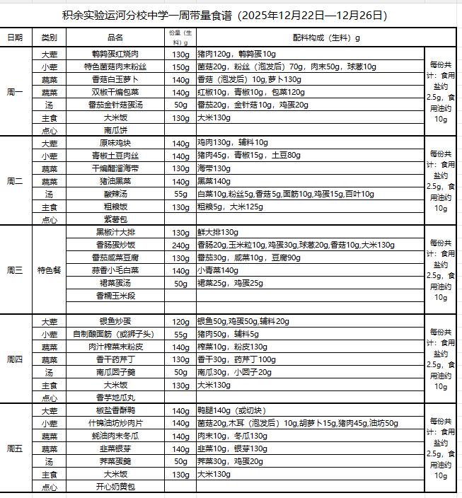 25年秋季第十九周菜单