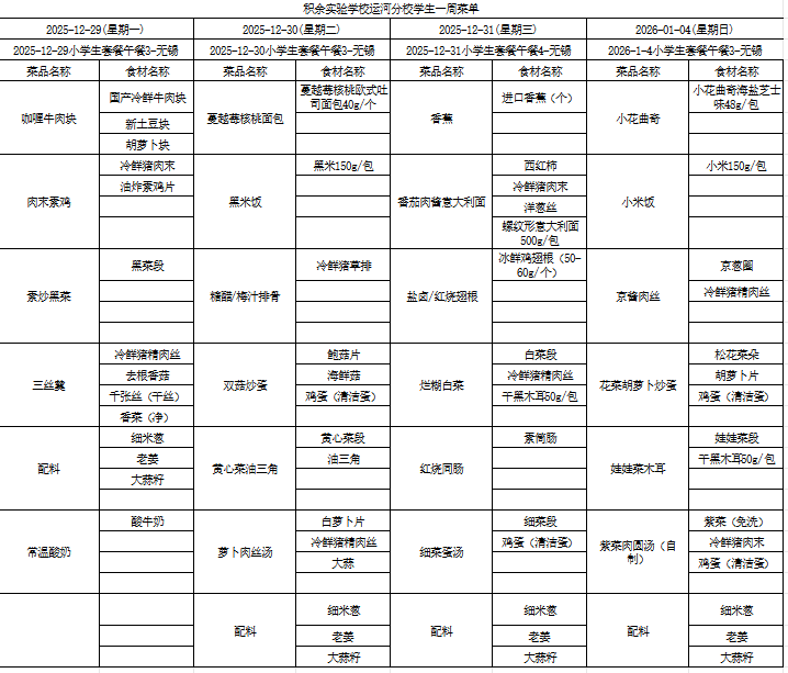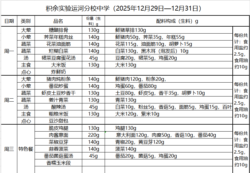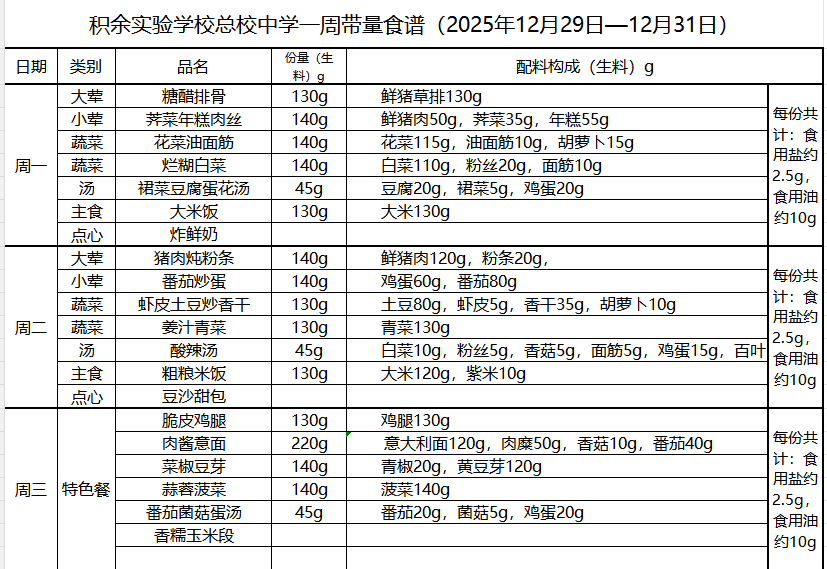 25年秋季第十五周菜单